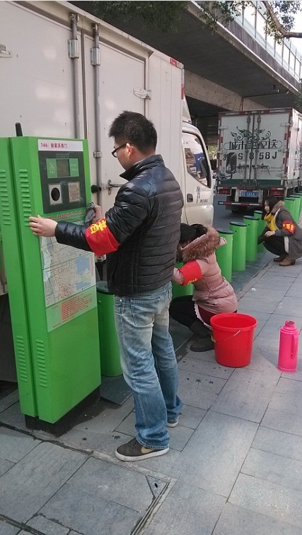 連日的陰雨天氣,使得公共自行車上沾滿了泥濘和污漬,社區組織志愿者為周邊的公共自行車進行擦洗,帶上提早準備好的水桶和抹布,用自己的實際行動對每一輛公共自行車進行了擦洗。認真,是每位志愿者的態度;細致,是每位志愿者的作風。志愿者們不但為每一輛車子進行了擦洗,還向過往的行人提倡“綠色出行”的環保理念。