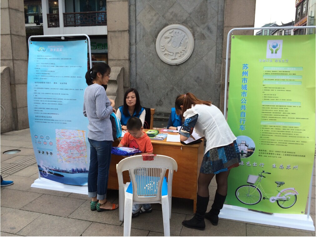 為倡導“低碳生活、綠色出行”的生態文明理念,借助“無車日”活動的契機,提倡城市公共自行車交通,傳播公共自行車文化。蘇州市市區道路停車管理所在9月20日上午(周六)開展公共自行車“一卡在手,騎樂無窮”宣傳活動,停車所青年職工和大學生志愿者一起參與到了此次活動的各項工作中。公共自行車配合此次活動,在觀前街設立了臨時辦卡點,并向成功辦卡的市民發放紀念品。