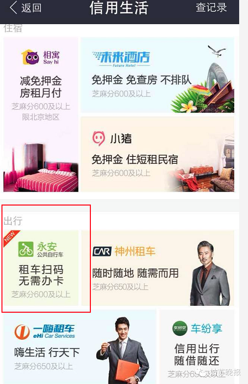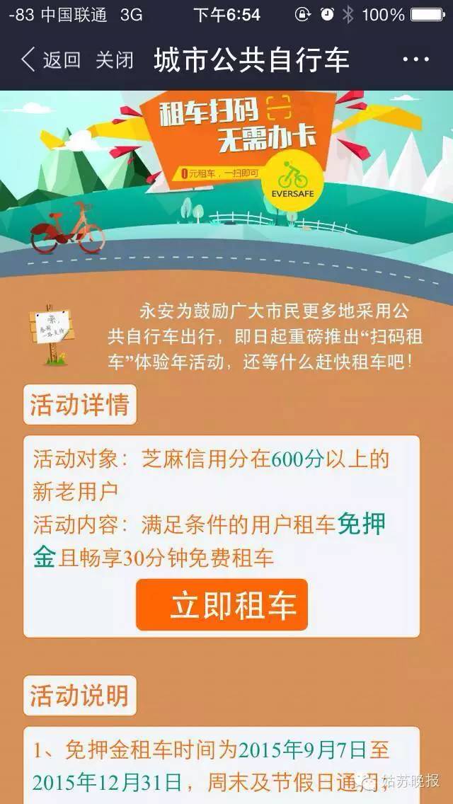 咱們總會有這種體驗 ↓↓↓ 不到一站的距離,可是走起來又好遠。就算坐公交做地鐵,還要折回去才到目的地。 這時候,路邊的綠色自行車就得瑟的看著你,“來找我啊來找我啊!” 可是一摸口袋,木有卡! 呵呵噠,從今天起,這些得瑟的綠色自行車請收起你們嘲笑的嘴臉,就算蘇州人沒辦自行車卡,或者沒帶卡,也可以想騎就騎啦~ 只需要一個條件: 芝麻信用卡超過600分 芝麻信用分,咱們辦公室平時幾乎不用支付寶,信用分都有671! 最近,公共自行車租車點的鎖車樁上多了一個二維碼,上面還有租車點的名稱、編號和鎖車樁的編號。 使用方法在此: 1、打開支付寶app,在右下角點擊“芝麻信用分” 2、點擊右下角的信用生活 3、在“信用生活”里找到“永安公共自行車” 4、然后根據提示綁定支付寶賬戶就可以掃碼租車啦 掃碼成功后鎖車樁會語音報號,確認后也就借車成功了。 還車不用掃碼,只要鎖車樁提示還車成功就可以。 這個真的可以有!相當方便,有時候忘記帶卡,或者壓根兒就沒有卡的蘇州小伙伴,你們的交通工具就在你們面前。 目前已開通50個站臺 芝麻信用分掃碼租車還在試點階段, 古城區地鐵1號線、2號線沿線以及觀前地區的50個站點都可以。 “芝麻信用分”在600分以上的市民均可以實現 免保證金租車,半小時內免費,超過半小時按0.5元/30分鐘計算,以此類推。 如果在借車過程中出現借車或還車不成功,也不要慌,除了可以撥打租車頁面的400電話,還可以撥打蘇州公共自行車的服務熱線。 哎呦不錯哦 這個周末出行 趕緊用起來吧~