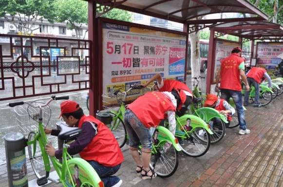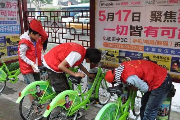 志愿者擦拭公共自行車