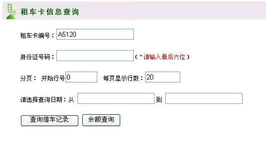 用戶只需將卡號與身份證號碼的最后六位輸入查詢系統中,就可以查詢余額和借還車記錄,如用戶沒有及時查詢余額,我們將會在余額低于20元時電話通知用戶。