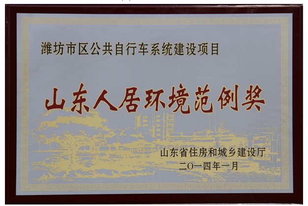 熱烈祝賀濰坊市區公共自行車系統建設項目獲山東人居環境范例獎!濰坊市公共自行車項目由常州永安公共自行車系統股份有限公司承建。