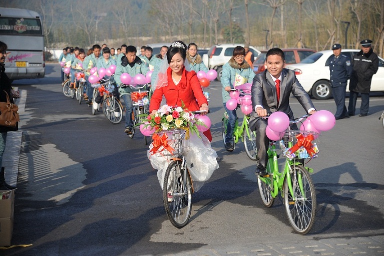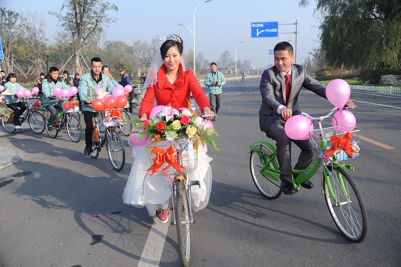 平日里他們就崇尚低碳環保,當公共自行車在徐州市驚艷亮相后,他們便決定用那抹象征生命的蘋果綠和象征熱情的橙紅來見證他們的愛情。