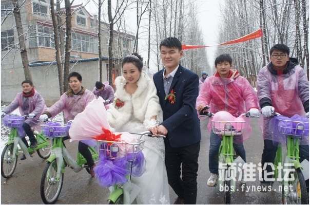 時云濤是一名年輕的90后,在阜陽臨沂商城從事門業生意。新娘名叫閆瑞金,是行流鎮高橋村人,新娘和新郎是高中同學,兩人戀愛至今已經走過了四五個年頭,大學期間兩人分隔兩地,新郎時云濤在大一時退學回家創業,自主創業生意也是越來越紅火,事業有成接下來就要抱得美人歸了,結婚無疑是一件人生大事,這結婚就是要結的與眾不同,什么樣的結婚形式才能更別出心裁呢,時云濤在采辦結婚用品的時候,碰巧看見了停放在臨沂商城附近的公共自行車,時云濤就想如果用公共自行車當婚車,不僅節能環保,而且整齊劃一,想想那齊刷刷排整齊的自行車迎親隊伍,效果應該是不一般的吸引眼球吧,于是這個創意婚禮的念頭就這樣應運而生。