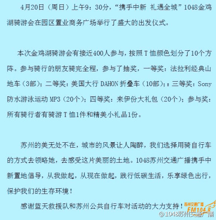 4月20日(周日)上午9:30分,“攜手中新 禮遇全城”1048金雞湖騎游會在園區(qū)置業(yè)商務(wù)廣場舉行了盛大的出發(fā)儀式。1048攜手中新置地倡導(dǎo),從我做起,踐行低碳生活,樂享綠色出行,保護(hù)我們的生存環(huán)境!感謝蘇州公共自行車對活動的大力支持!