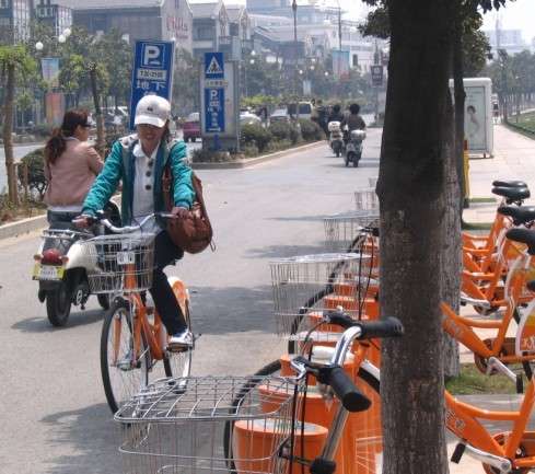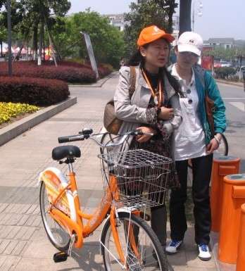 4月25日常熟公共自行車試運營,常熟便民公共自行車服務中心的工作人員向市民介紹如何辦理公共自行車借車卡,并熱情向市民解答公共自行車的相關疑問,并有市民在街頭試騎公共自行車。