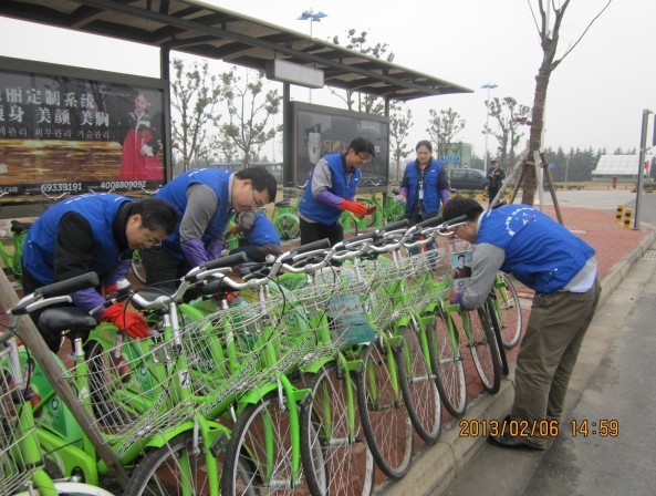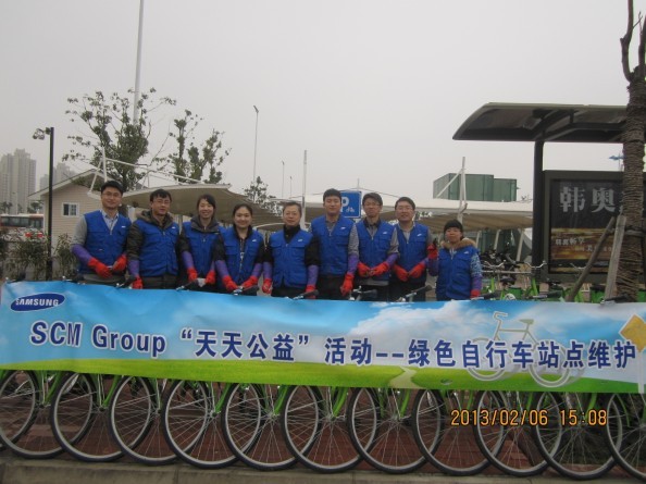 在活動現場有些自行車需要調整零件的,懂自行車維護的同志就自告奮勇的站出來擔當這個任務,有些自行車需要清潔工作的,就拿起抹布認真仔細地擦試,不一會兒工夫一個又一個站點在他們熟練的動作中形成一道道美麗的風景線。三星顯示器有限公司率先從自身做起,將環保理念深入員工帶動市民,以實際行動支持環保事業。