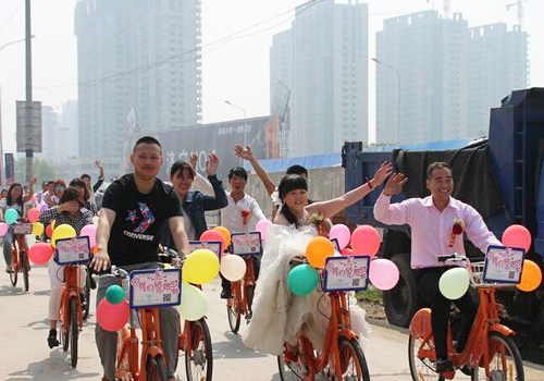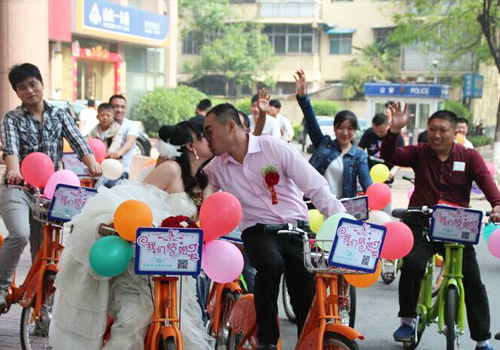 城區內現最“亮”婚車隊——浪漫與環保并舉 婚禮當日,城區街頭出現了一片“壯觀”的景象——30人騎著掛滿氣球的公共自行車,組成一排“豪氣”的婚禮車隊。在隊伍最前端“領騎”的是一對新人,新娘身著一襲潔白婚紗、人群中顯得清新亮麗,新郎身著筆挺的西裝,打著領帶,胸前佩戴著鮮艷的胸花,英俊帥氣?! ∵@支公共自行車迎親隊從古槐路黨校大廈出發,最后到達西郊宋南村。所到之處無不吸引市民的駐足觀看,大家一邊報以贊許的目光和微笑祝福新人,一邊紛紛拿出手機記錄這與眾不同的時刻?!?“用自行車當婚車,真浪漫??!這比寶馬、奔馳接新娘子拉風多了!”,在古槐路等公交車的宋先生說這是他第一次看到新郎用自行車接媳婦,和租用豪華轎車“接親”相比,用自行車既浪漫又環保。