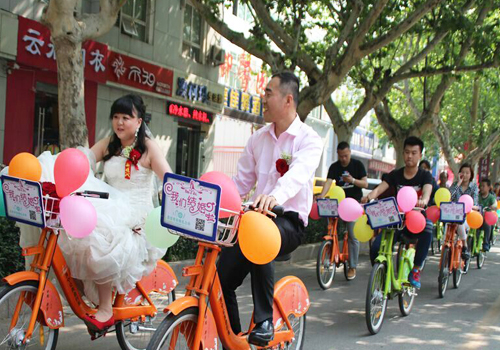 公共自行車婚車隊,濟寧還是頭一回新郎邵寧告訴記者,其實一開始只是抱著試試看的態度,撥通了濟寧市公共自行車管理中心的熱線電話,詢問能否租借30輛公共自行車?!皼]想到管理中心的領導表示非常支持,為我們準備了30輛,而且是免費提供,并且由專車運送到家門口,我們真的很感動。”邵寧笑著回憶。據市公共自行車管理中心副主任王偉介紹,自濟寧公共自行車項目運行以來,這還是第一次被用作“婚車”,表示對這對新人的做法非常支持。婚禮當天一早,就安排工作人員將備好的30輛自行車運送到新郎家門口。并在此希望以后有更多市民參與這種低碳出行的方式,既低碳環保,又新穎有創意。