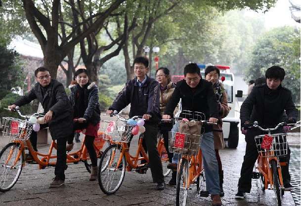 2月14日,吳江推出雙人公共自行車,分別投放于吳江公園和蘇州河,由于恰逢西方情人節,所以借此機會,在吳江公園內舉辦了“情侶同騎雙人公共自行車”的活動。12點58分活動按時進行,雖然陰雨蒙蒙,但經過的情侶都會停下來看看這"稀罕"的雙人公共自行車,在工作人員的鼓勵下,情侶們紛紛踏著雙人自行車繞著公園騎了起來。另外,只要試騎雙人公共自行車的情侶都可以領取工作人員準備的玫瑰花和巧克力。