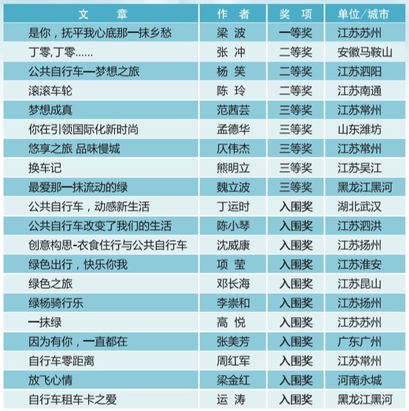 2014年5月底,常州永安公共自行車系統股份有限公司發布了“衣食住行與公共自行車”有獎征文大賽,征稿時間僅短短兩個月,社會各界和公司上下熱烈響應,踴躍投稿。截止至7月底,我們一共收到征文投稿70多篇,有歌頌綠色出行的篇章,有弘揚低碳環保的詩文,有仰望永安夢想之旅的贊歌。經過初步篩選,根據征文大賽的評選要求,邀請專業評委組進行最終評審,評選出一等獎1名,二等獎3名,三等獎5名,入圍獎11名?,F予以公布,詳見附圖。