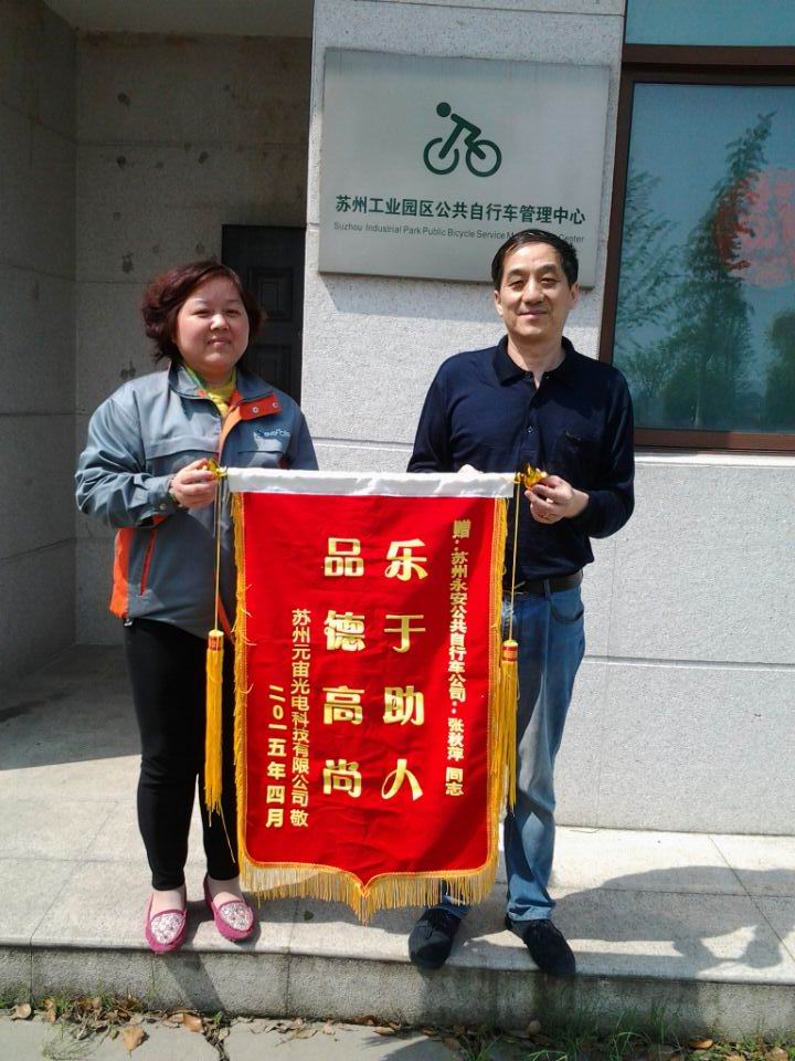 2015年4月23(周四)日中午,蘇州公共自行車經(jīng)理助理張女士檢查公共自行車站點時,撿到兩個文件袋,她在當(dāng)?shù)氐攘撕芫茫瑹o人認領(lǐng)。方打開文件袋檢查兩個文件袋,發(fā)現(xiàn)文件袋內(nèi)裝有寶馬、本田的機動車登記證書、車輛購置稅證明(正本)、保單各一份,從保單上查找到失主的單位。張經(jīng)理隨即打電話給客服人員,通過百度查詢失主的單位電話號碼與失主同事取得聯(lián)系并交還給失主同事。此時,失主并無察覺到物品遺失。