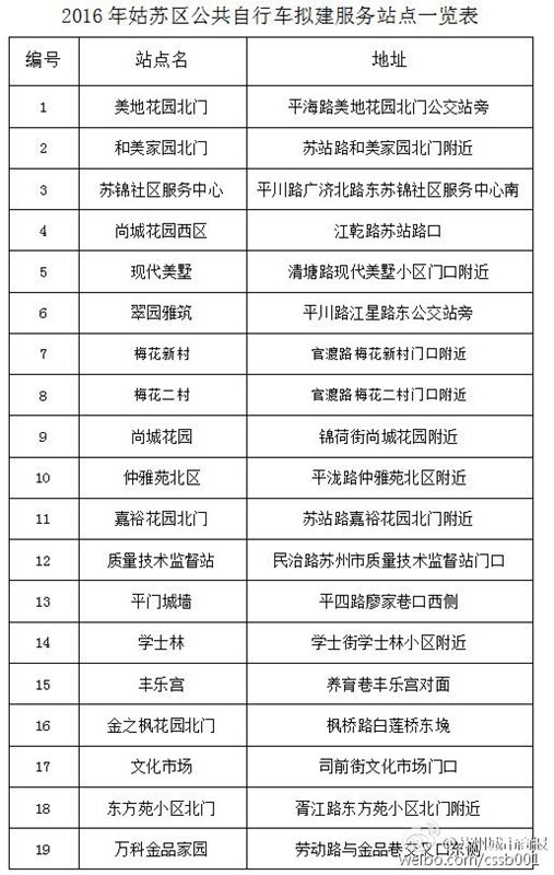 姑蘇區(qū)公共自行車服務(wù)網(wǎng)點(diǎn)擬定2016年新建70個(gè),計(jì)劃投放公共自行車2000輛?,F(xiàn)將前期60個(gè)站點(diǎn)予以公示。公示時(shí)間4月18日-4月25日,如有意見或建議可通過電話、郵件及12345便民熱線等方式向市市容市政管理局反映。電子郵件:szbicycle@126.com;市數(shù)字城管:0512-69331110;其他方式:12345便民熱線 寒山聞鐘論壇。